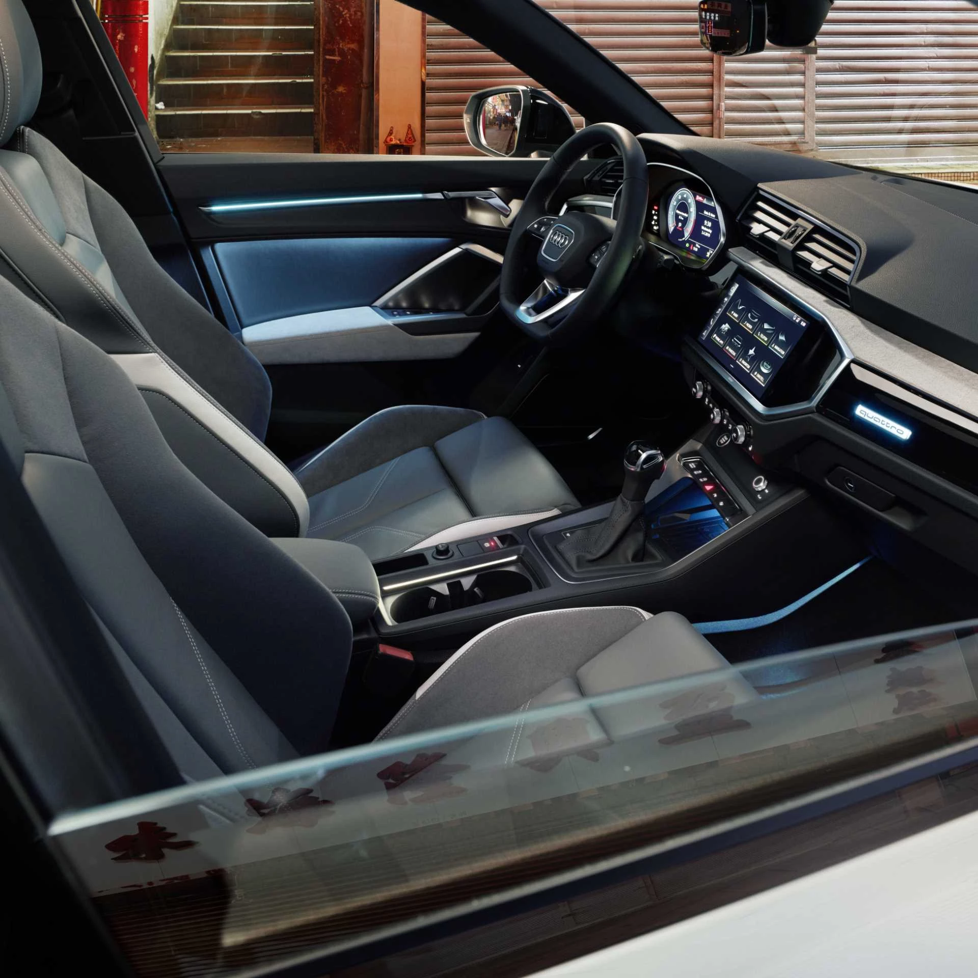 I Audi Q3 Sportbvack kan du vælge mellem en lang række af interiørpakker som fx design selection-interiør (ekstraudstyr). Den omfatter sportssæder foran, ambientebelysningspakke plus og Dimension-dekorindlæg i mørkt aluminium